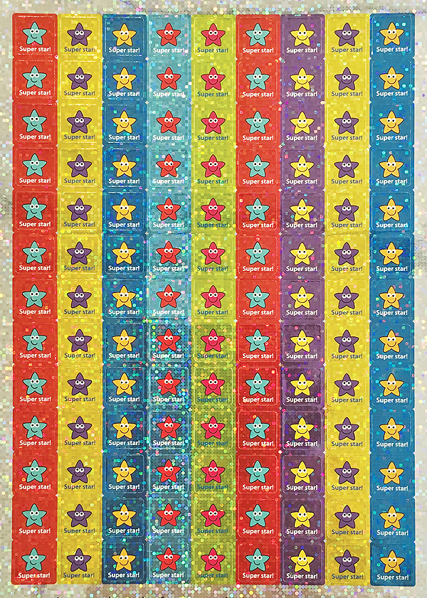 12 mm velké třpytivé čtvercové samolepky s nápisem Super star - krásná odměna za velké snažení. Balení obsahuje 4 archy, každý se 117 samolepkami.