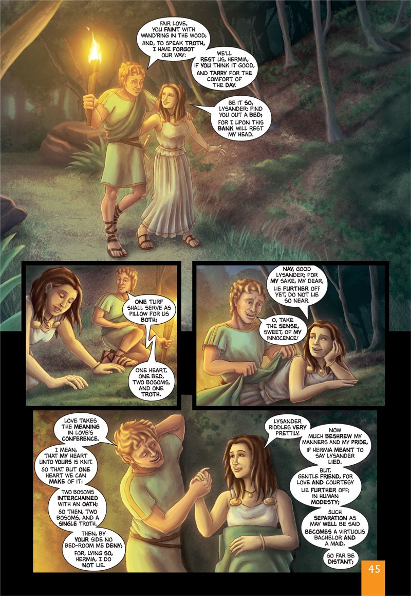 Celá, nezjednodušená originální hra v komiksové podobě. Shakespearova divácky nejoblíbenější hra, Sen noci svatojánské je stále jednoznačná volba pro teplé letní večery na otevřených divadelních scénách. Chystaná svatba mezi Theseem a Hippolytou slouží jako pozadí k složitým příběhům lásek, amaterských divadelníků a hádce mezi pohádkovou královnou a králem Titanií a Oberonem. Příhody jejich pohádkového království přesahují až do reality skutečného lesa. Script Adaptation: John McDonald Characters & Artwork: Kat Nicholson & Jason Cardy Lettering: Jim Campbell. Shakespeare Titles: Original Text - Toto je celý, nezkrácený originální text – přesně tak, jak jej Shakespeare vytvořil. Tato verze je ideální pro puristy, studenty a čtenáře, kteří chtějí zakusit nijak neupravený text. Plain Text -Vzali jsme originální text a převedli jsme jej do moderní angličtiny, verš po verši, a při tom jsme zachovali úplnou podstatu hry. Pokud jste někdy chtěli ocenit kvalitu Shakespearových prací, ale originální jazyk se Vám zdál příliš složitý, pak je tato veze určena právě Vám. Quick Text - Vzali jsem jednotlivé dialogy a zkrátili jsme je do co nejmenšího počtu slov. Protože se však jedná o stejné dílo, i tato verze zachovává všechny postavy, zápletky a motivy ze hry. Verze je ideální pro mladé čtenáře, studenty angličtiny a všechny, kdo se chtějí se hrou rychle a úplně seznámit.