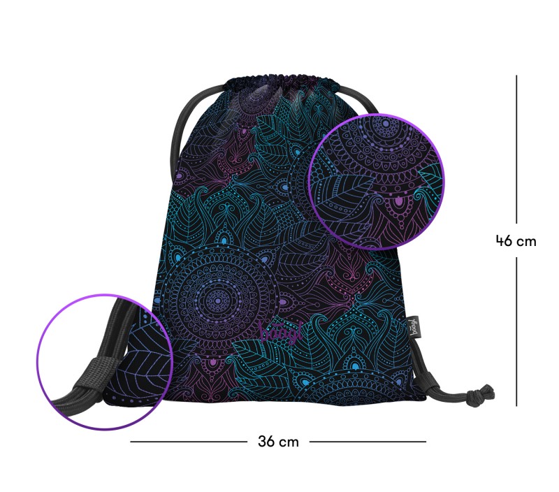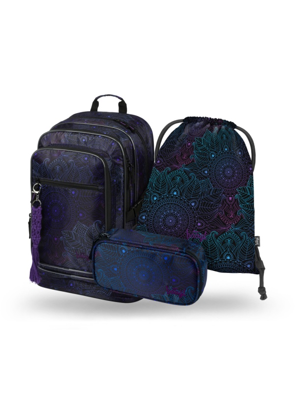 Dívčí školní set složený z batohu Cubic, prakticého penálu a sáčku na obuv s oblíbeným motivem mandaly.