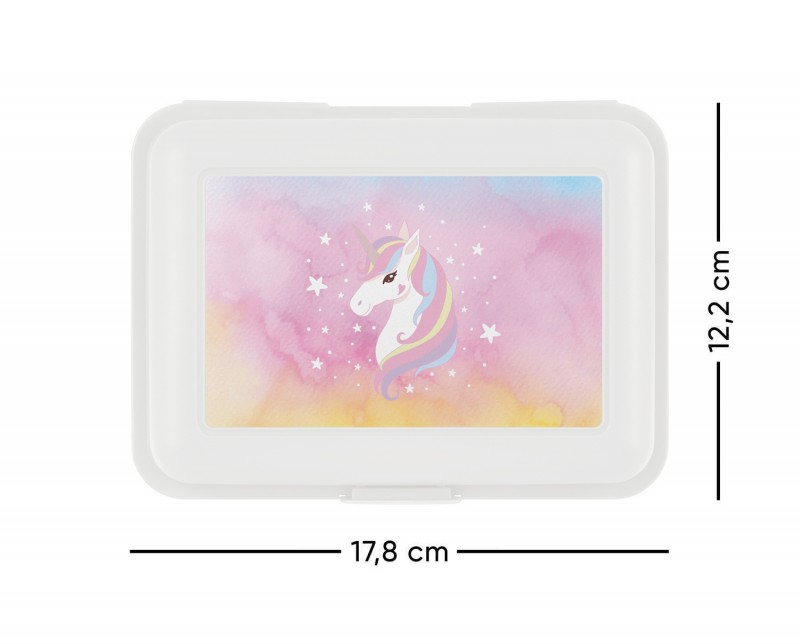Jednorožec, hvězdy, duhové pozadí, oblíbený motiv malých školaček, na svačinovém boxu.