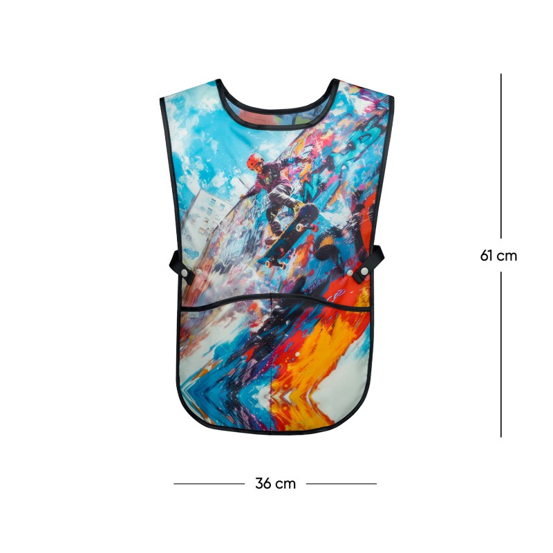 V dolní části zástěry najdete praktické kapsy, kam si mohou děti schovat své malířské náčiní nebo jiné drobnosti. Materiál zástěry je omyvatelný, což usnadňuje její údržbu a udržuje ji v čistotě. S touto zástěrou se děti budou cítit jako skuteční umělci a zároveň bude ochráněna jejich oblečení před nečistotami. Skvělá kombinace praktičnosti a zábavy!