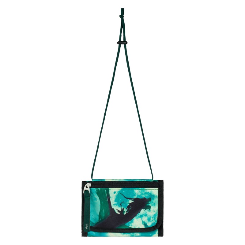 Zelená peněženka s obrázkem draka, která se dá zavěsit na krk. Bezpečně tak uschová drobné, čip na oběd nebo klíček od skříňky.
