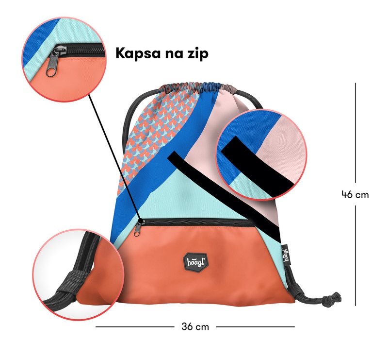 • Sáček je vyroben z pevného omyvatelného materiálu a v jeho dolní části je umístěna praktická kapsička na zip.