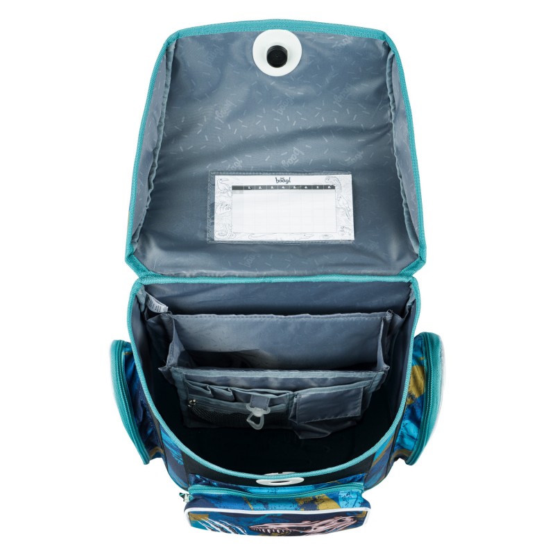• Uvnitř aktovky je průhledná kapsa na rozvrh a vnitřní organizér umožňující rovnoměrné rozložení hmotnosti.