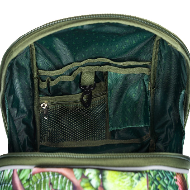Zelený školní set Shelly Dinosaurus složený z aktovky, dvoupatrového penálu a praktického sáčku na obuv.