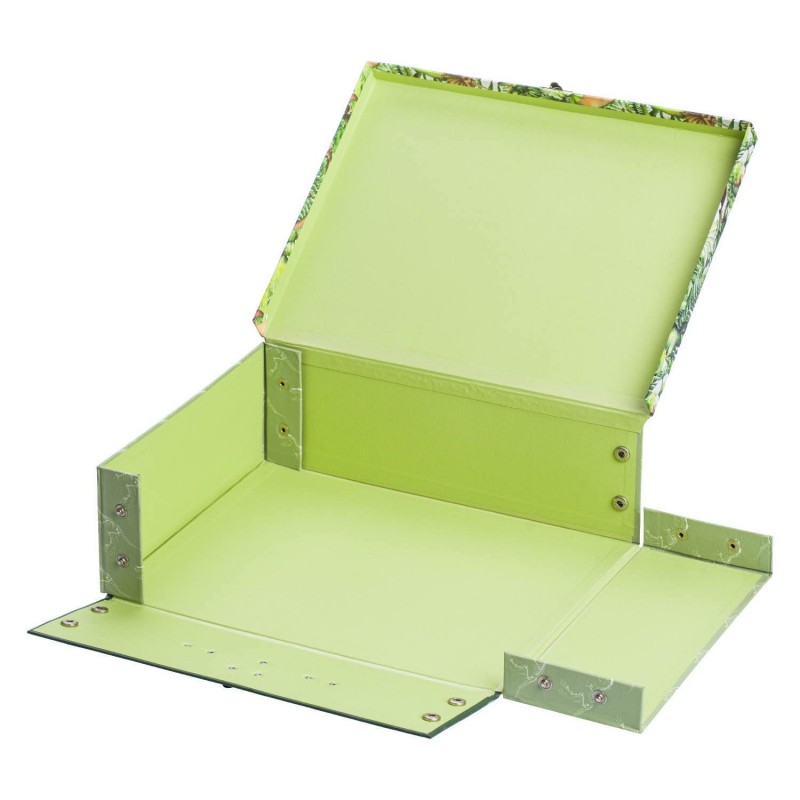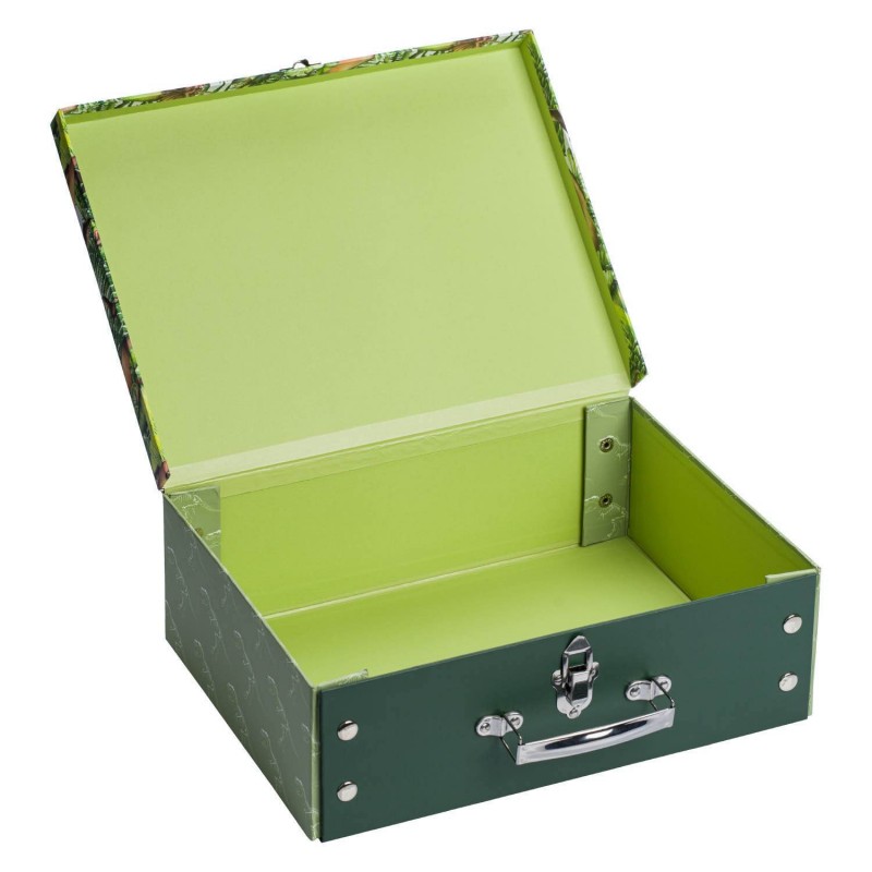 Zelenkavý znovu rozkládací kufřík s dinosaurem T-Rexem bezpečně uschová všechny školní potřeby. Jednoduchý systém skládání pomocí patentků.