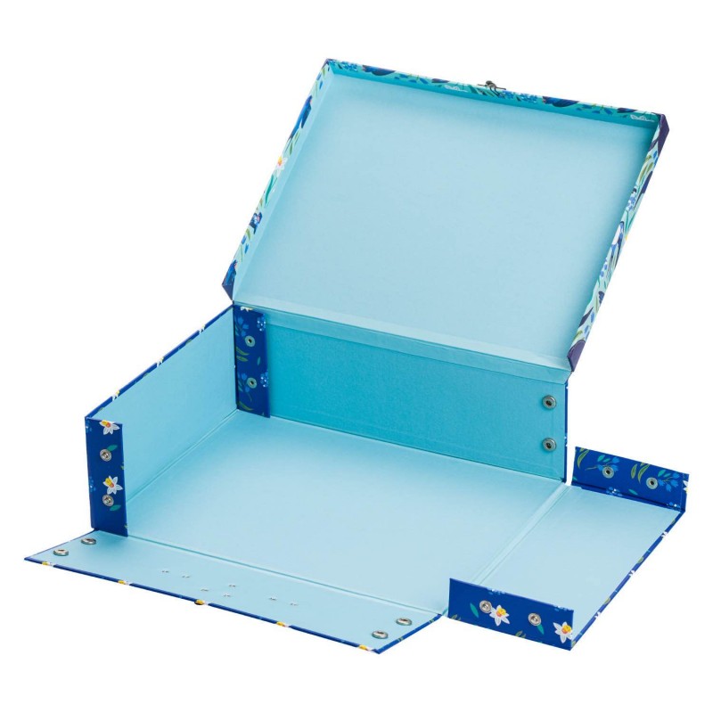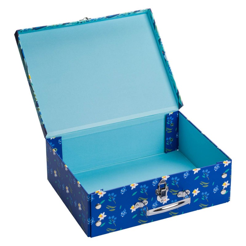 Papírový znovu rozkládací kufřík v modré barvě s veselými vlaštovkami bezpečně uschová všechny školní potřeby. Jednoduchý systém skládání pomocí patentků.