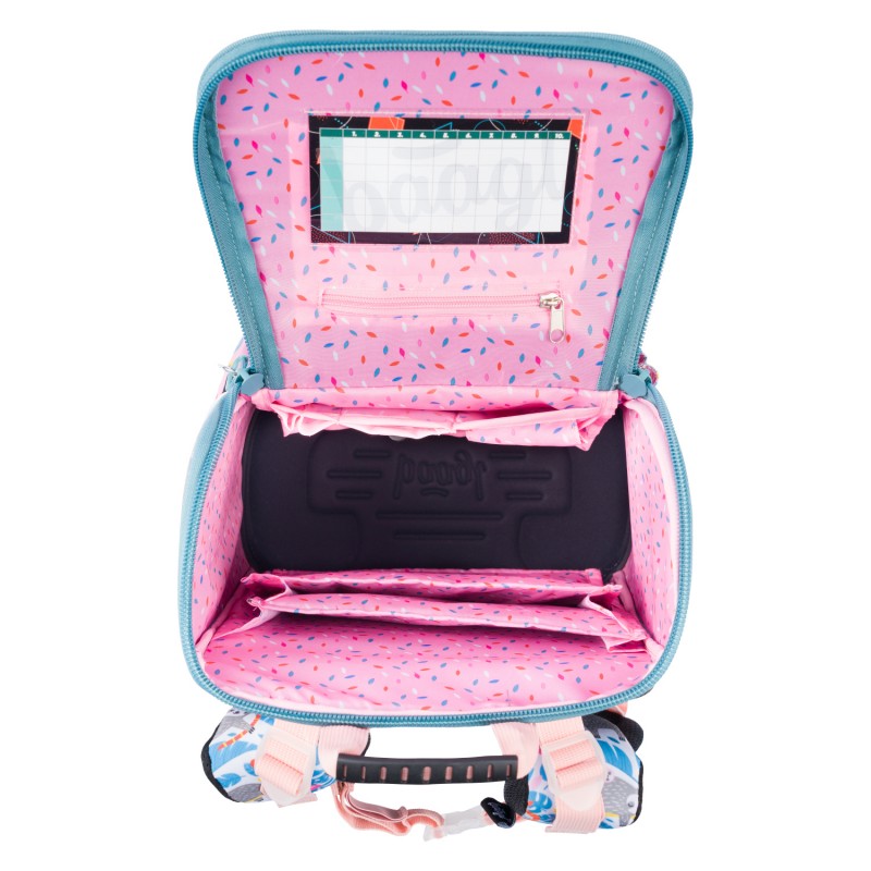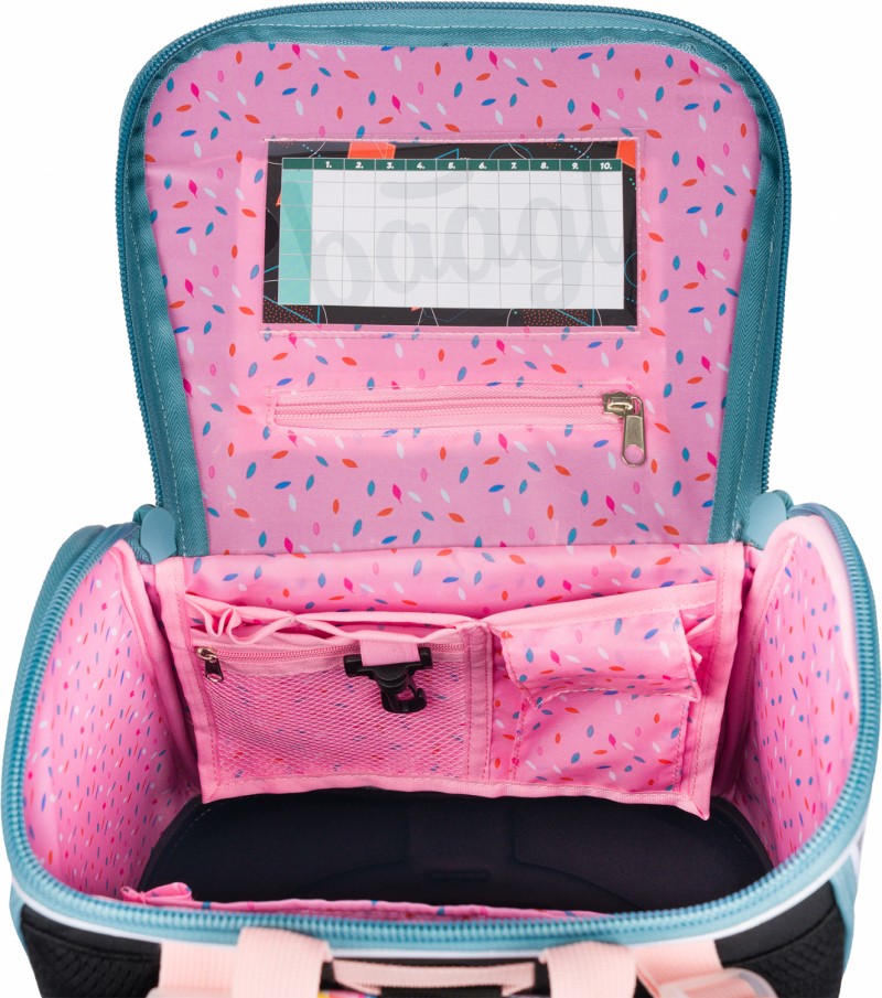 • Uvnitř aktovky je průhledná kapsa s rozvrhem a vnitřní organizér umožňující rovnoměrné rozložení hmotnosti, doplněný gumičkou pro fixaci.