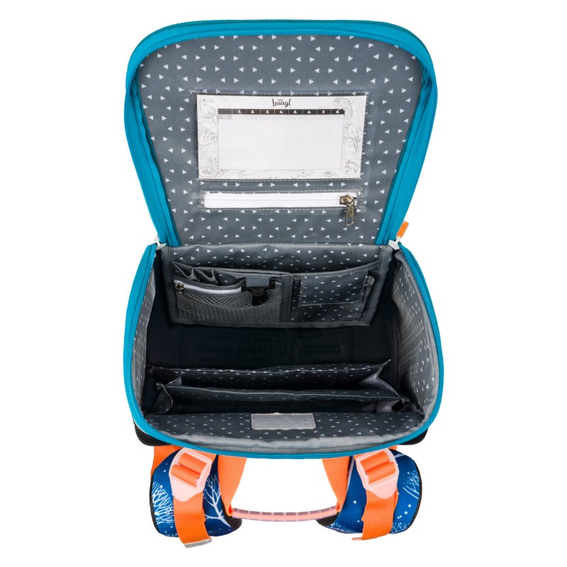 • Uvnitř aktovky je průhledná kapsa s rozvrhem a vnitřní organizér umožňující rovnoměrné rozložení hmotnosti, doplněný gumičkou pro fixaci.