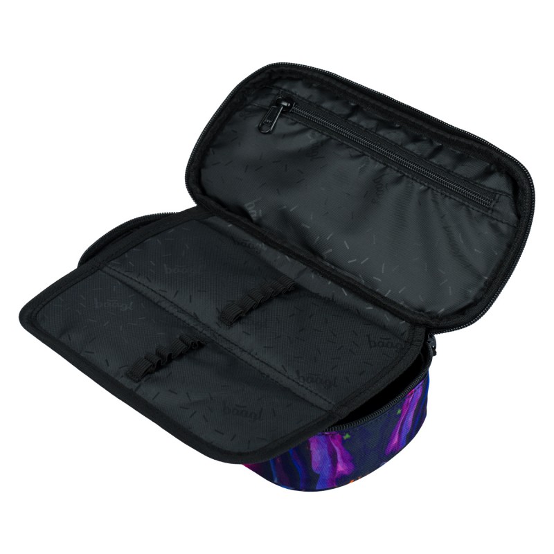 Prostorný penál s barevným abstraktním motivem. Součástí penálu z recyklovaného materiálu je hlavní kapsa a výklopná kapsička s přepážkou a gumičkami na tužky a jiné psací potřeby.