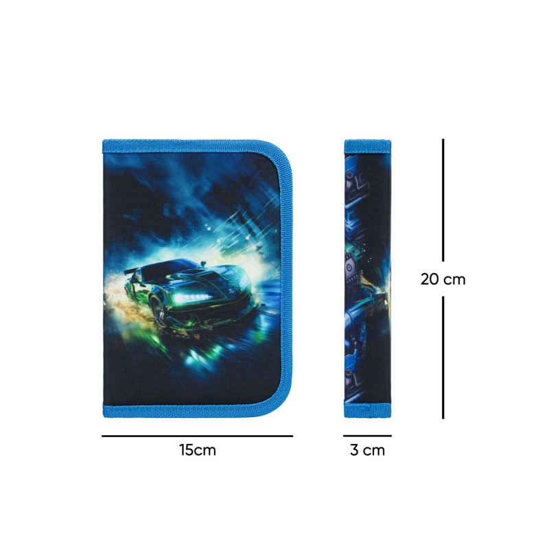 BAAGL Školní penál jednopatrový Závodní auto je skvělým doplňkem pro každého školáka. Tento klasický penál disponuje dvěma chlopněmi pro snadné uspořádání psacích potřeb a drobností.