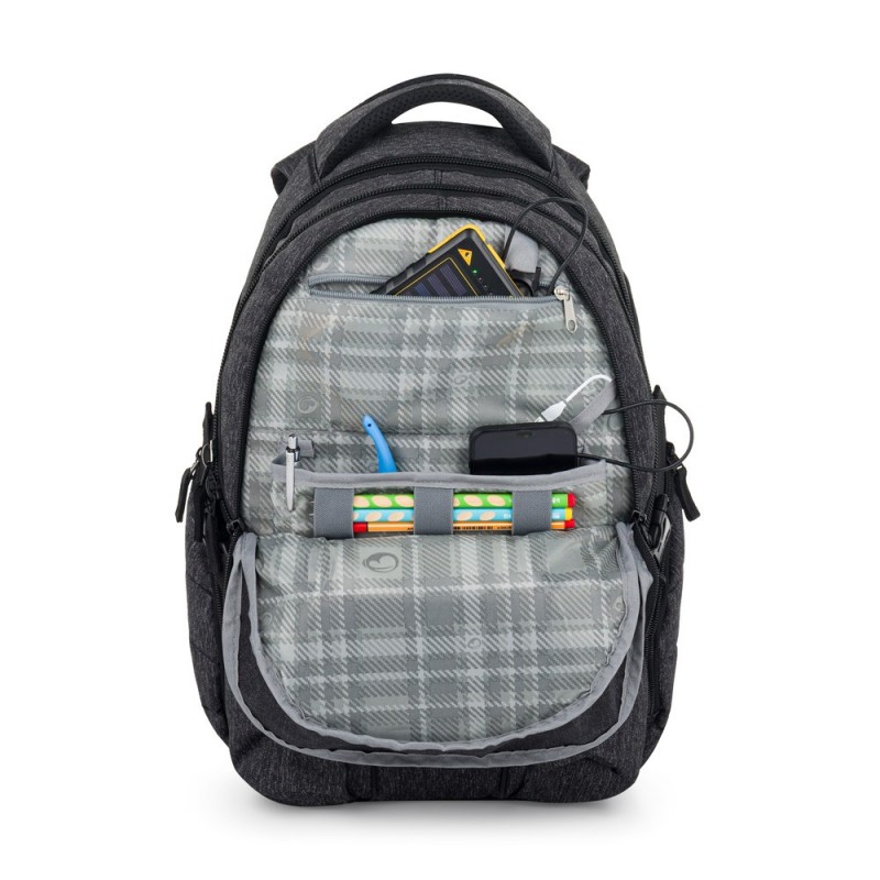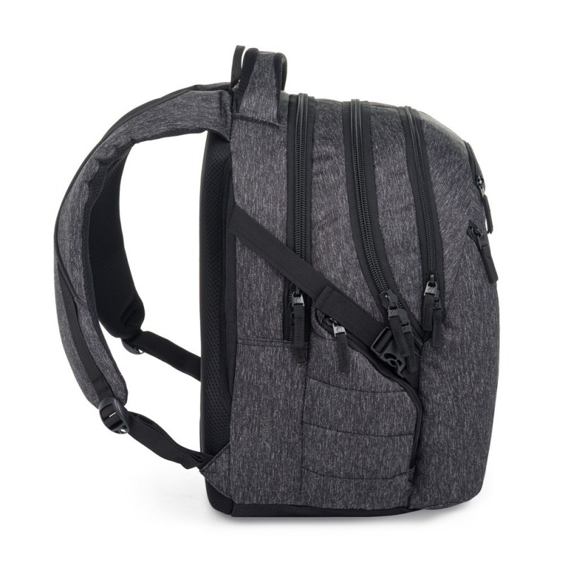 Šedý školní batoh pro školačky a školáky od 4. třídy, kteří potřebují místo na spoustu věcí. Má tři prostorné komory s polstrovanou přihrádkou na notebook 15” a spoustu menších kapes na různé drobnosti. Do bočních kapes se vejde i láhev 1,5 l. Zádová část batohu je anatomicky tvarovaná a měkce polstrovaná. Stejně jako ramenní popruhy. Na bočních stranách jsou kompresní popruhy pro nastavení hloubky batohu nebo uchycení flašky. Samozřejmostí jsou reflexní prvky.
