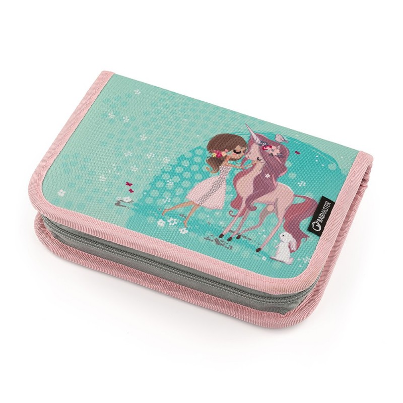Jemný holčičí penál s jednorožcem a panenkou vhodný pro malé školačky na první stupeň. V gumových úchytech na dvou chlopních je dostatek místa na všechny potřebné školní pomůcky. Pouzdro se uzavírá kvalitním zipem. Je lehké a v batohu nezabírá moc místa.