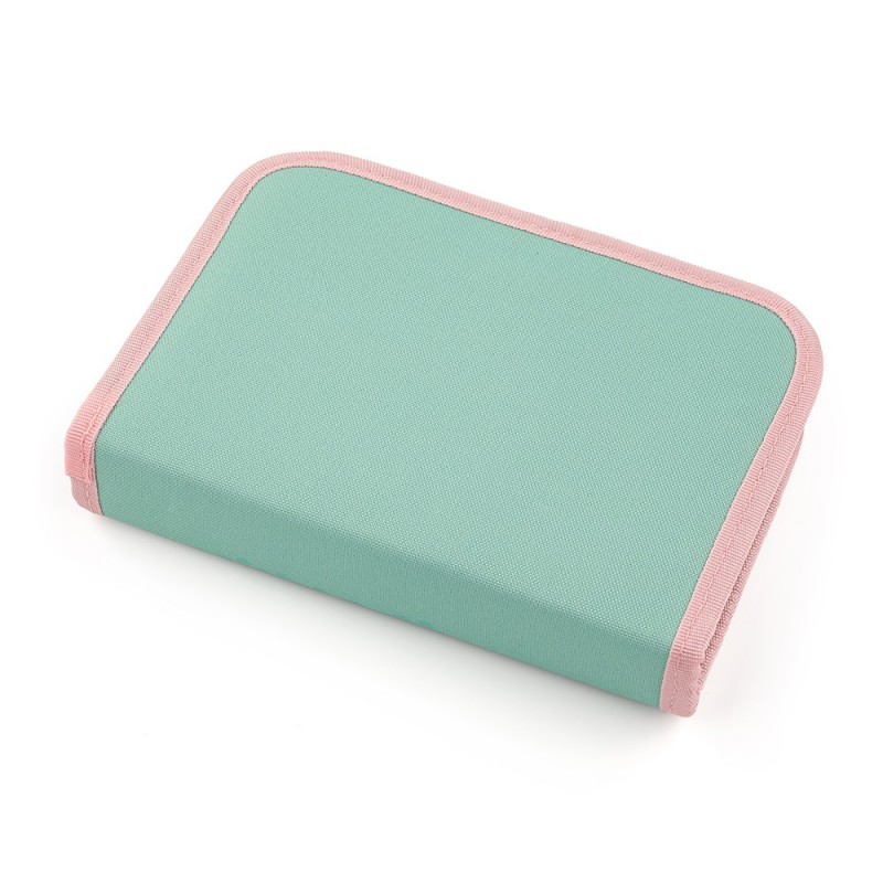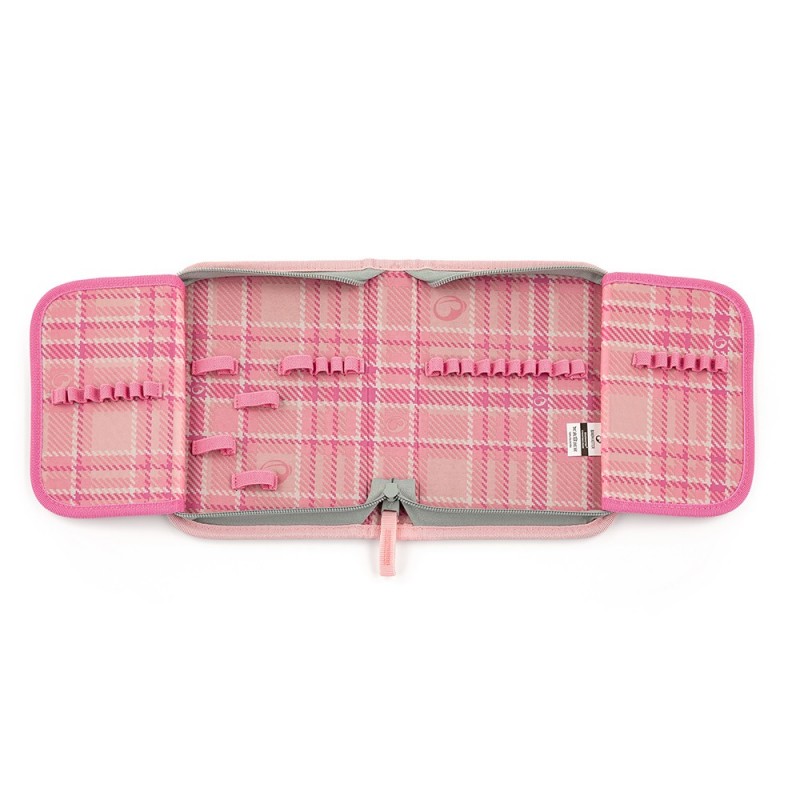 - Na dvou otevíravých chlopních je 32 pružných gumových úchytů na pastelky, pera, fixy, gumu, nůžky, kružítko a další pomůcky.