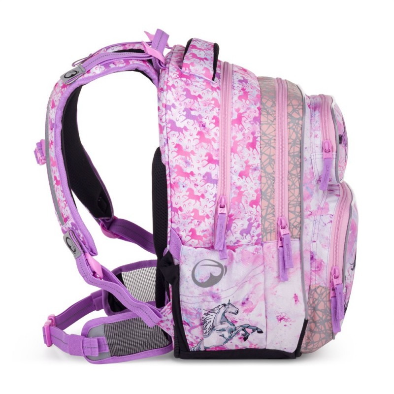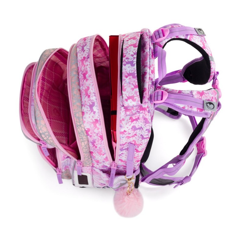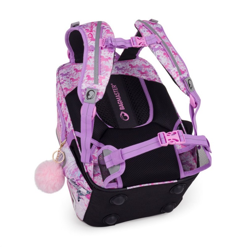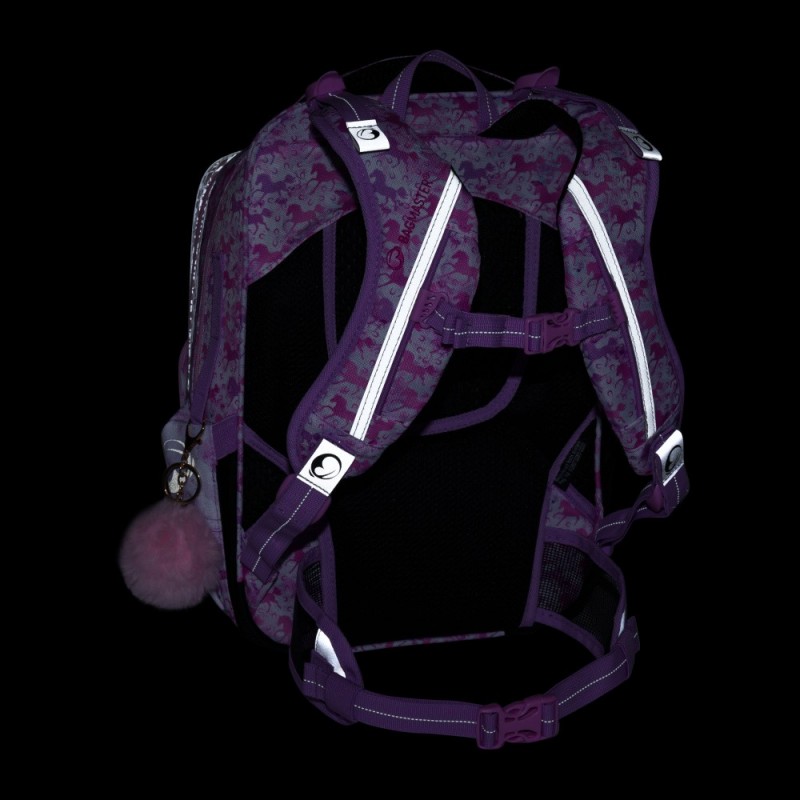 Batoh je extra lehký, přitom prostorný. Má dvě velké komory a dvě praktické přední kapsičky. Stojí na plastových nožkách, ve tmě svítí reflexní prvky. Zádový systém s nastavitelným hrudním pásem a odlehčeným vyjímatelným bederním pásem má zdravotní posudek. K batohu bude školačce ladit penál na psací potřeby a látkový vak na přezůvky nebo školní úbor.