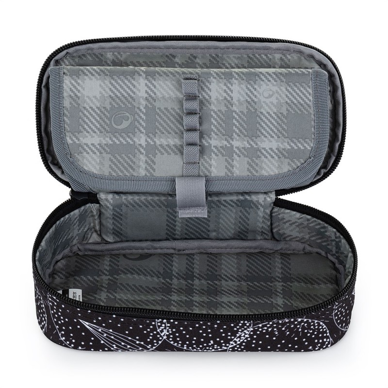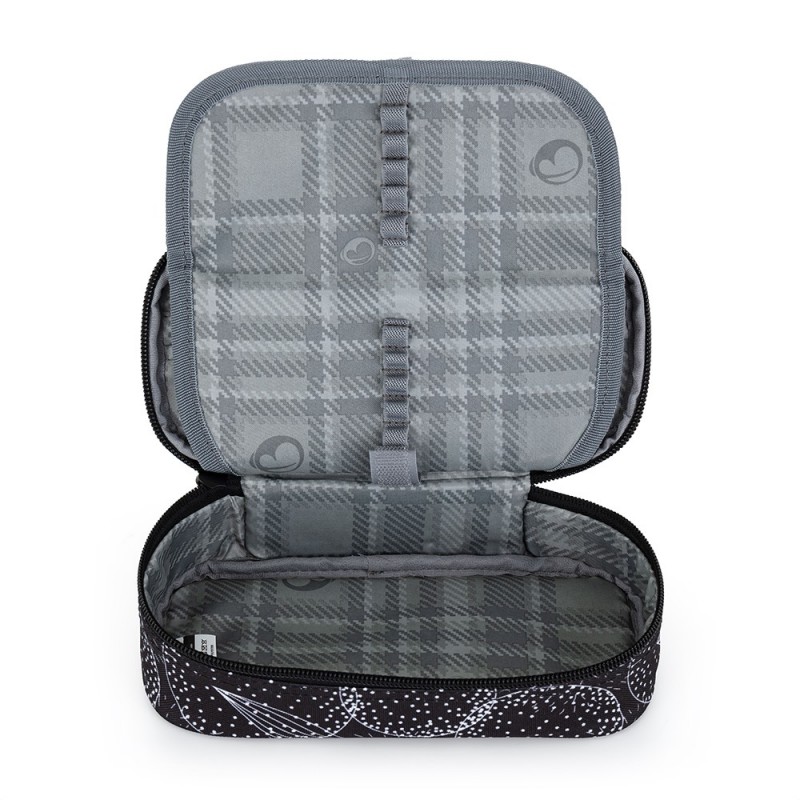 Penál na školní pomůcky pro malou školačku od 4. třídy. Pod hezkým obalem je schovaných 20 gumových poutek na propisky, pera a pastelky. Do prostoru pod přepážkou se vejdou další pomůcky jako nůžky nebo lepidlo.