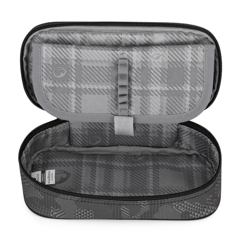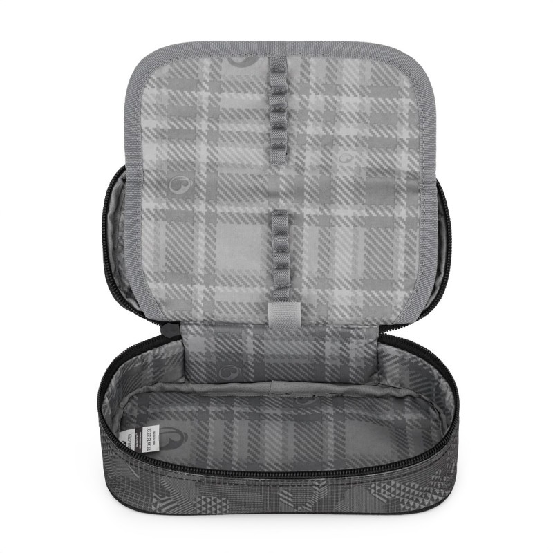 Šedý penál pro malé školáky a školačky. Na dvojité přepážce jsou gumová poutka na psací potřeby, další pomůcky se vejdou do prostoru pod přepážkou. Zapíná se pohodlně zipem s jedním taháčkem.