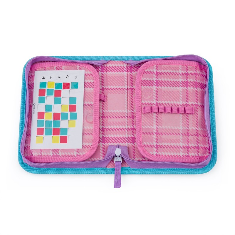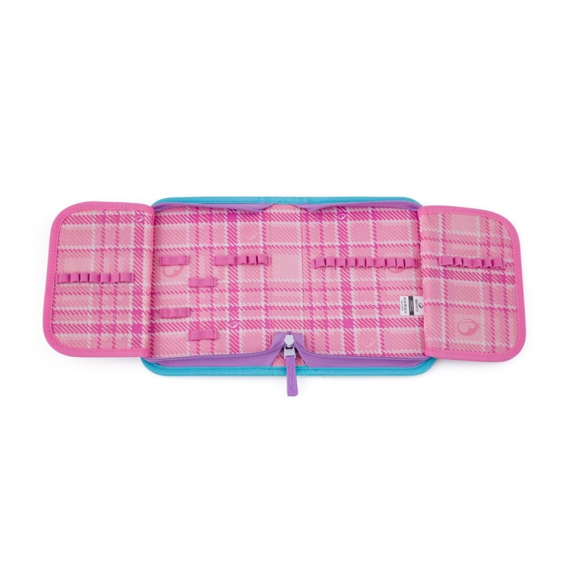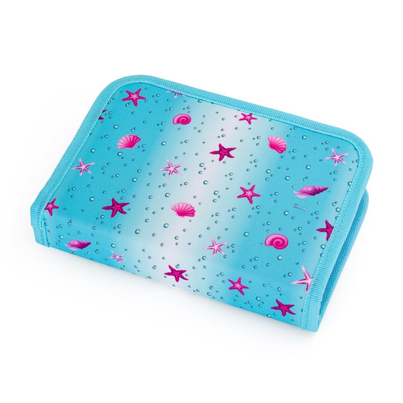 Růžovo-modré pouzdro s podmořským světem pro malé školačky. Na dvou otevíravých chlopních jsou gumové úchyty na tužky, pera a pastelky a kapsičky na další drobnosti.