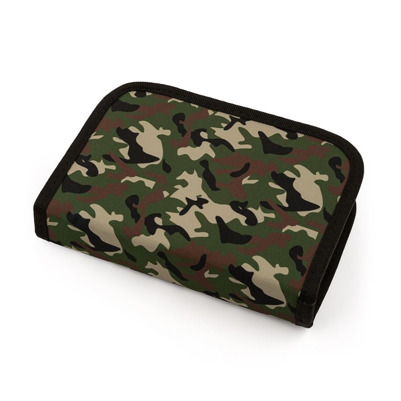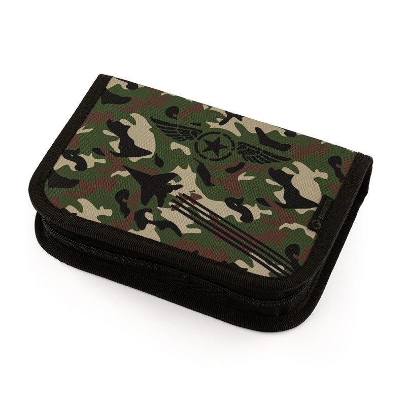 Vojenský penál se stíhačkami pro malé raubíře, kteří se chystají do školy. Jedna přehledná komora s chlopní plná pružných gumových úchytů na psací potřeby. Kvalitní kovový zip a průhledná kapsa na rozvrh se samolepkami, který dostanete jako dárek.