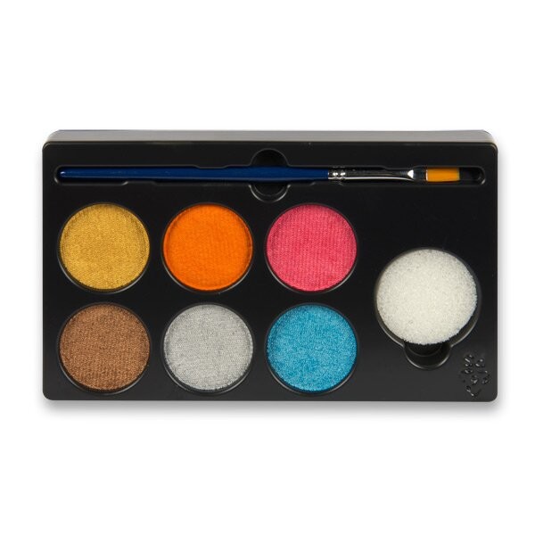 Set obličejových barev obsahuje 6 ks metalických barev po cca 6 g, 1x štěteček, 1x houbičku. Barvy se snadno nanášejí na obličej pomocí houbičky nebo štětečku. Velmi dobře kryjí, mají syté barvy, dobře drží na těle a jsou odolné vůči rozmazání. Lehce smývatelné vodou a mýdlem. Lze je použít i pro bodypainting,,