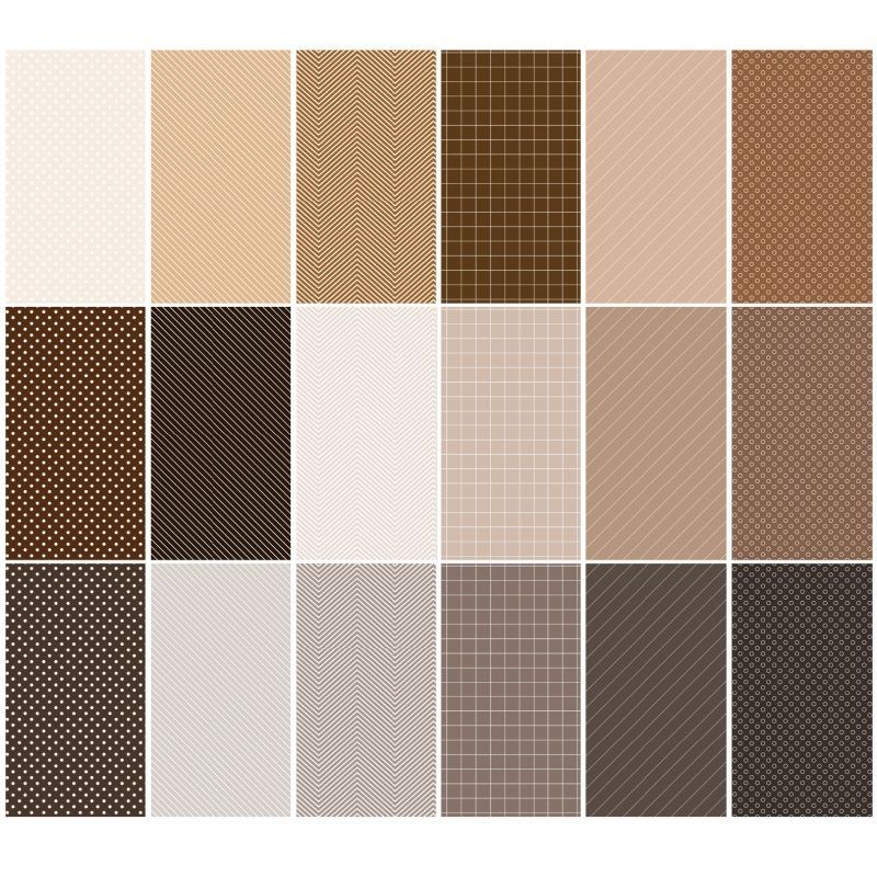 Blok vzorovaných papírů na kreativní tvoření. 36 (18 x 2) listů v odstínech hnědé, oboustranný matný potisk – jedna strana jednobarevná, druhá strana s jemným motivem (proužky, kostičky, vlnky apod). Gramáž 170 g/m2. Formát A5.