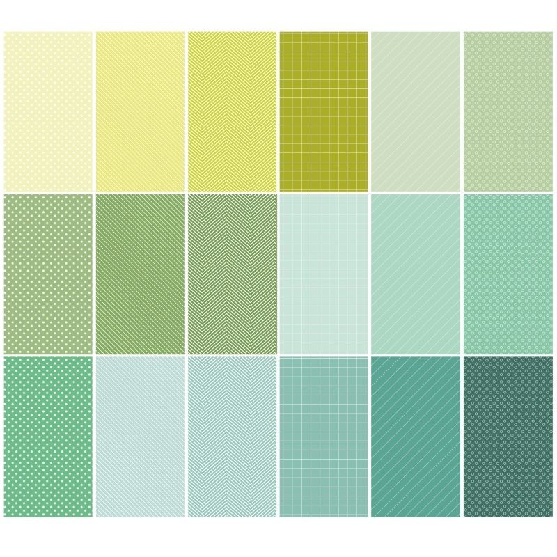 Blok vzorovaných papírů na kreativní tvoření. 36 (18 x 2) listů v odstínech zelené, oboustranný matný potisk – jedna strana jednobarevná, druhá strana s jemným motivem (proužky, kostičky, vlnky apod). Gramáž 170 g/m2. Formát A5.