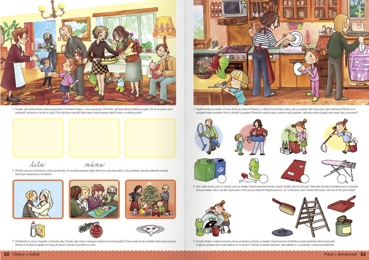 - Forma učebních úkolů podporuje samostatné aktivity a tvořivost žáků. Pracovní obrazový materiál pro žáky je postupně provázán s textem, který navazuje na rozvoj čtení a psaní v českém jazyce.