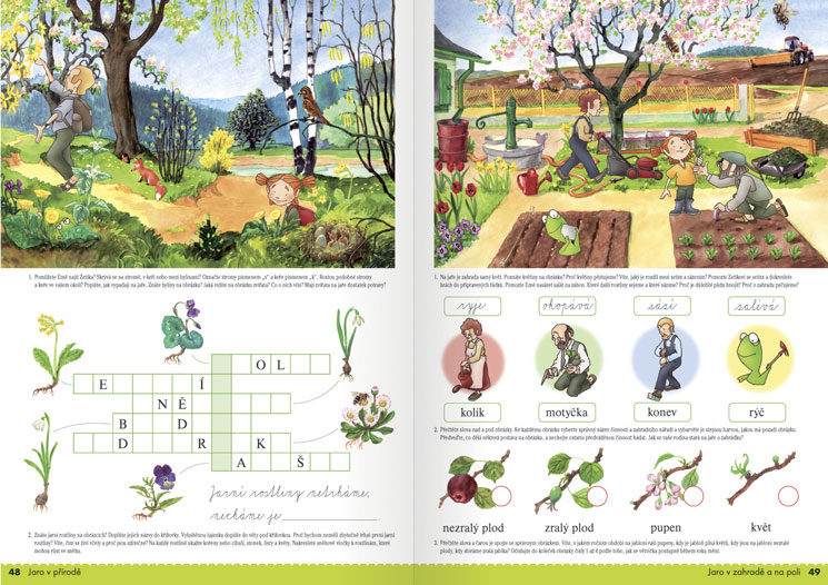 Průvodní postavičky moderní pracovní učebnice seznamují děti s proměnami přírody a činnostmi lidí během roku, směřují k pochopení života, vztahů, ale i problémů ve škole, rodině i společnosti, přispívají k osvojení vhodného mezilidského chování a jednání.