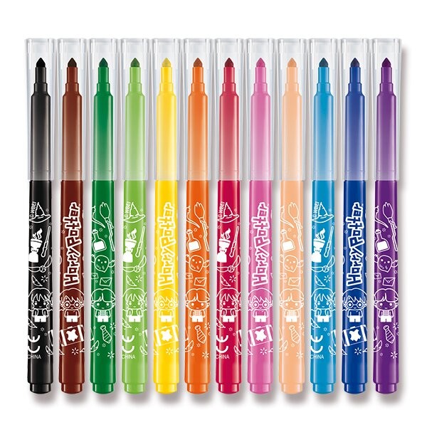 Souprava 12 kusů barevných fixů se snadno vypratelným a omyvatelným inkoustem s atraktivními motivy Harryho Potter mají zářivé barvy, hrot odolný proti zatlačení či poškození a účinný uzávěr. Dlouhá životnost. Trojúhelníkový úchop pro lepší a pohodlnější držení. Praktické pouzdro s uzavíráním na zip. Šíře stopy 3,6 mm