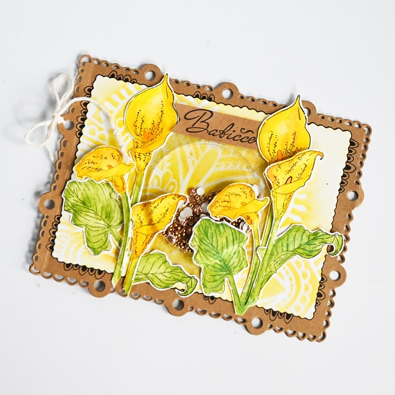 Sada silikonových razítek s hlavním motivem lilie kala a dalšími drobnými doplňkovými razítky. V sadě je celkem 11 ks razítek, velikost platíčka 14,8 x 10,5 cm.