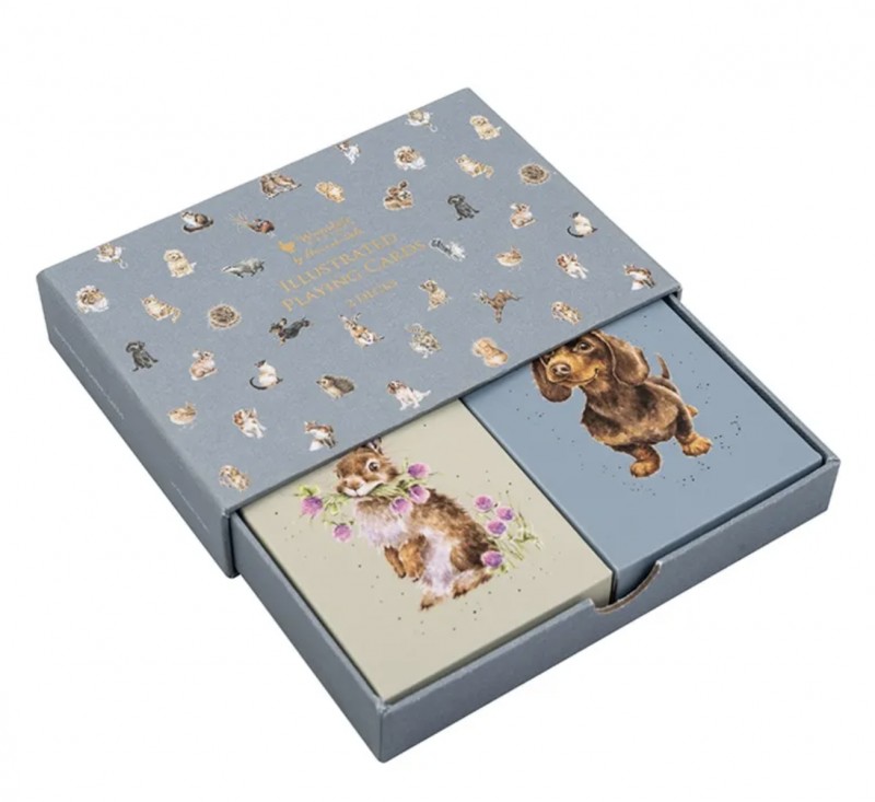 Sada dvou balíčků hracích karet nabízí nekonečné možnosti zábavy a her. Motivy karet jsou lesní zvířata, psi a kočky. Vše zabalené v nádherné dárkové krabičce se zlatými nápisy. Rozměry 9,5 x 13 x 2 cm.