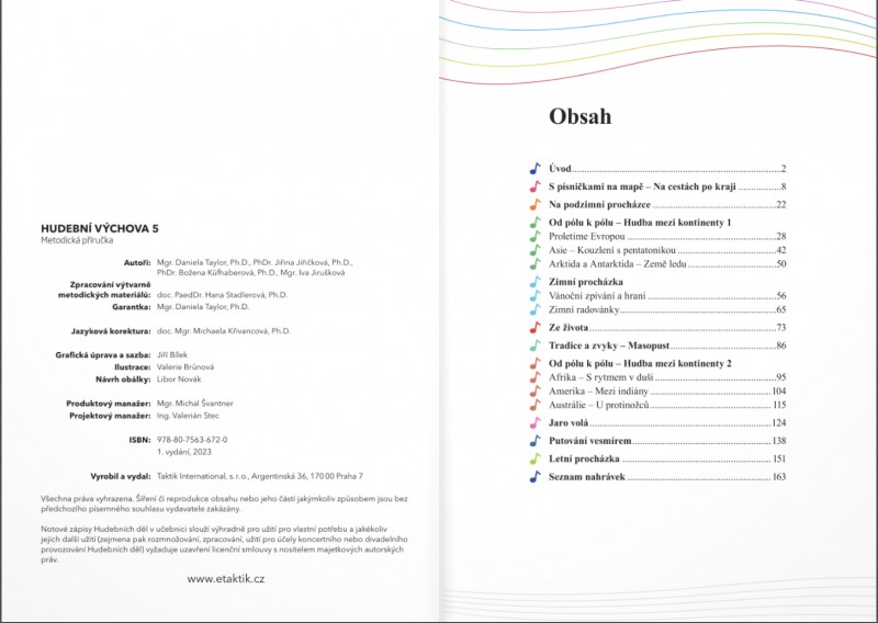 Metodická příručka obsahuje pokyny k vedení výuky hudební výchovy pro 5. ročník ZŠ od vydavatelství Taktik. Zahrnuje jasně stanovenou strukturu hodiny, což pomáhá v hodině nejen méně zkušeným vyučujícím.