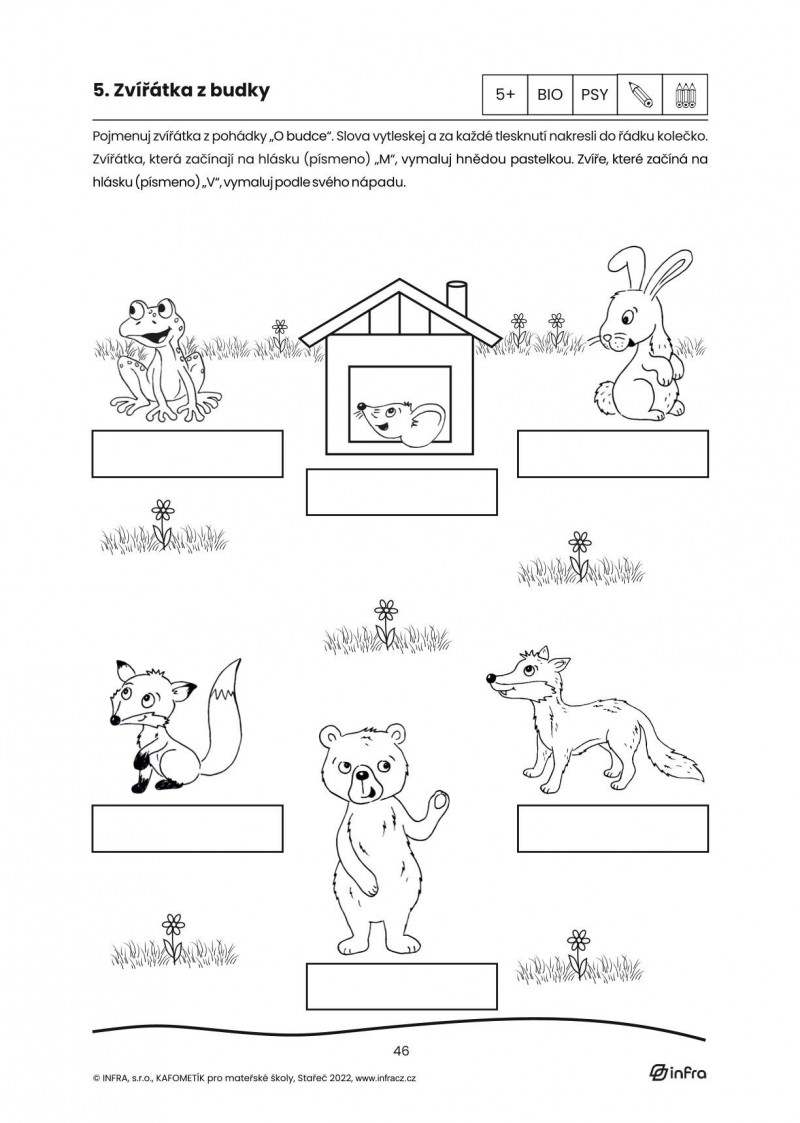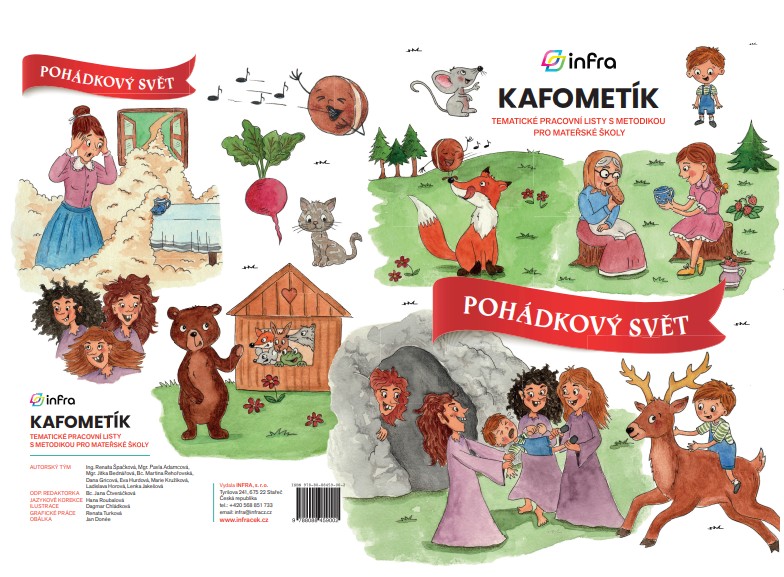 KAFOMETÍK jsme tentokrát rozdělili na kapitoly dle pohádek. Jednotlivé kapitoly začínají úvodní pohádkou, se kterou nadále pracujeme v metodice s doporučením výtvarných a pohybových aktivit. Každá kapitola obsahuje několik básniček a písniček inspirovaných pohádkou, dále malované čtení a 10 pracovních listů pro děti od 3-6 let. Jednotlivé pohádky tak tvoří tematický celek. Děti si pomocí pracovních listů procvičí grafomotorické prvky, čtenářskou i matematickou pregramotnost, zahrají si s kamarády různé hry, procvičí paměť, zahrají divadlo, mohou stříhat, malovat a vyplňovat úkoly inspirované pohádkami s krásnými kresbami paní Dagmar Chládkové.