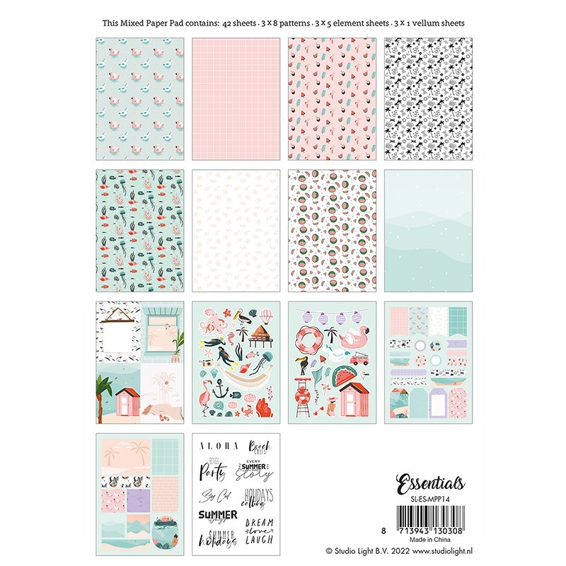 Sada vzorovaných kartonů a obrázků s motivy z pláže pro papírové tvoření a scrapbooking. V sadě je 42 listů, velikost A5. Gramáž 170 g/m2.