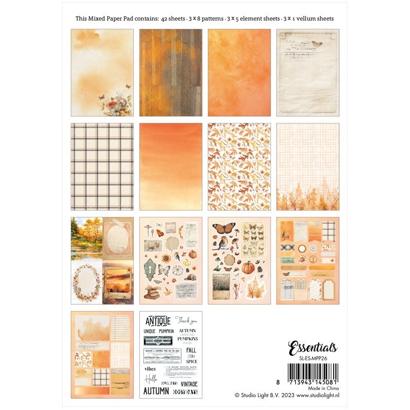 Blok kreativních papírů s podzimními motivy, obrázky k vystřižení a vellum papíry. Vhodné na scrapbooking, cardmaking a další papírové tvoření. 42 listů – 3 x 8 vzorovaných papírů, 3 x 5 obrázků a kartiček na vystřižení, 3 x 1 pergamenových papírů. Formát A5, gramáž 170 g/m2.