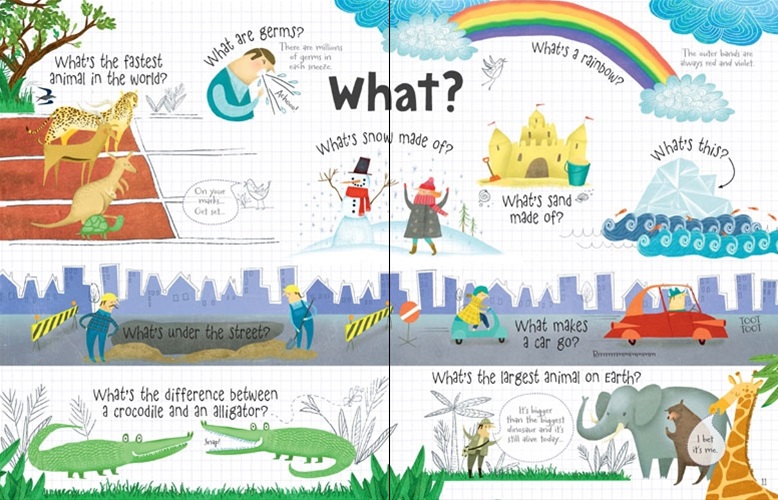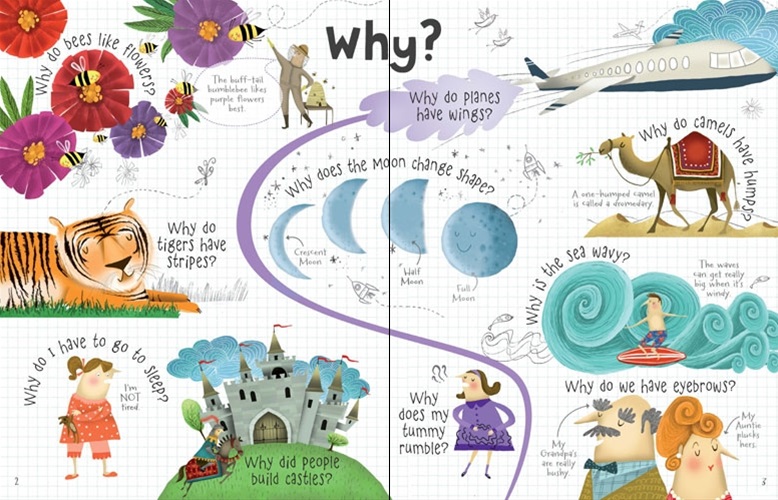An interactive board book with over 60 flaps, exploring all kinds of questions that young children love to ask. Children will enjoy lifting the flaps to discover who, what, when, where, how, which and why. Provides friendly, simple answers to challenging questions, with entertaining and informative illustrations. A perfect book to dip into – great for inquisitive little ones!
