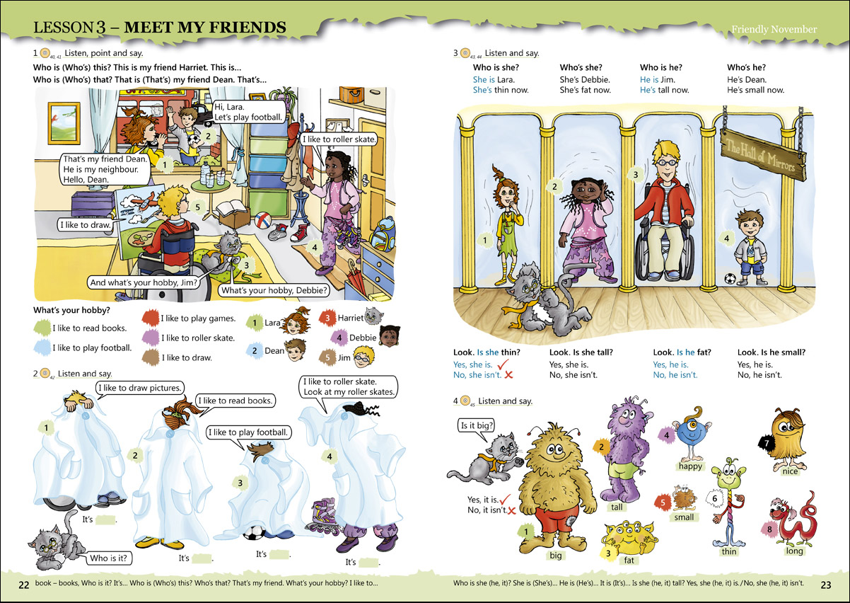 Učebnice je vhodná i pro žáky, kteří začínají s angličtinou až ve 3. třídě. Žáky 3. ročníku provází učebními materiály skupinka dětí a kočička kouzelnice. Žáci s nimi prožívají různá dobrodružství, při kterých zvládnou učivo tohoto ročníku. Učebnice anglického jazyka obsahují kromě klasického textu informačního charakteru mnoho zajímavých prvků: čtenářské rozcvičky, cvičení pro nácvik správné výslovnosti, praktické opakování učiva lekce, projektová cvičení určená k cyklickému opakování učiva aj. Celobarevné strany s velmi poutavými obrázky zpříjemní atmosféru výuky. Předností je zpracování učiva do tematických celků po jednotlivých měsících. Učebnice je vhodná i pro žáky, kteří začínají s angličtinou až ve 3. třídě.