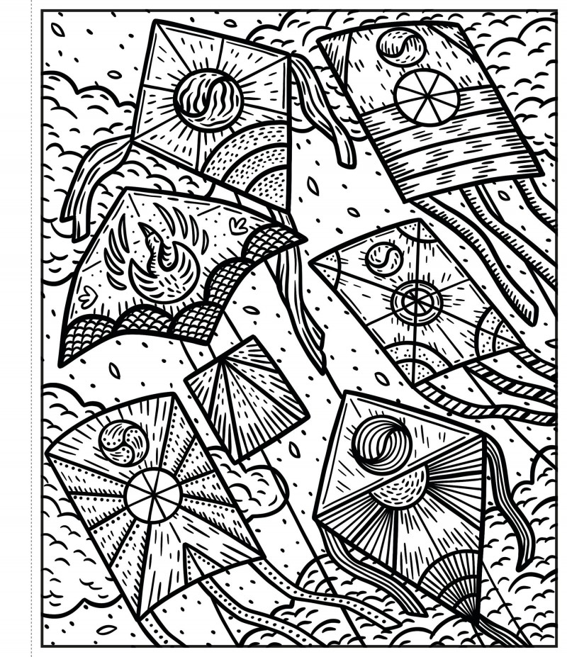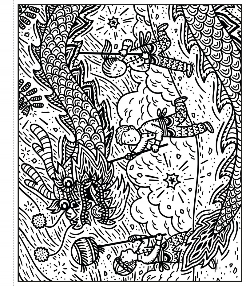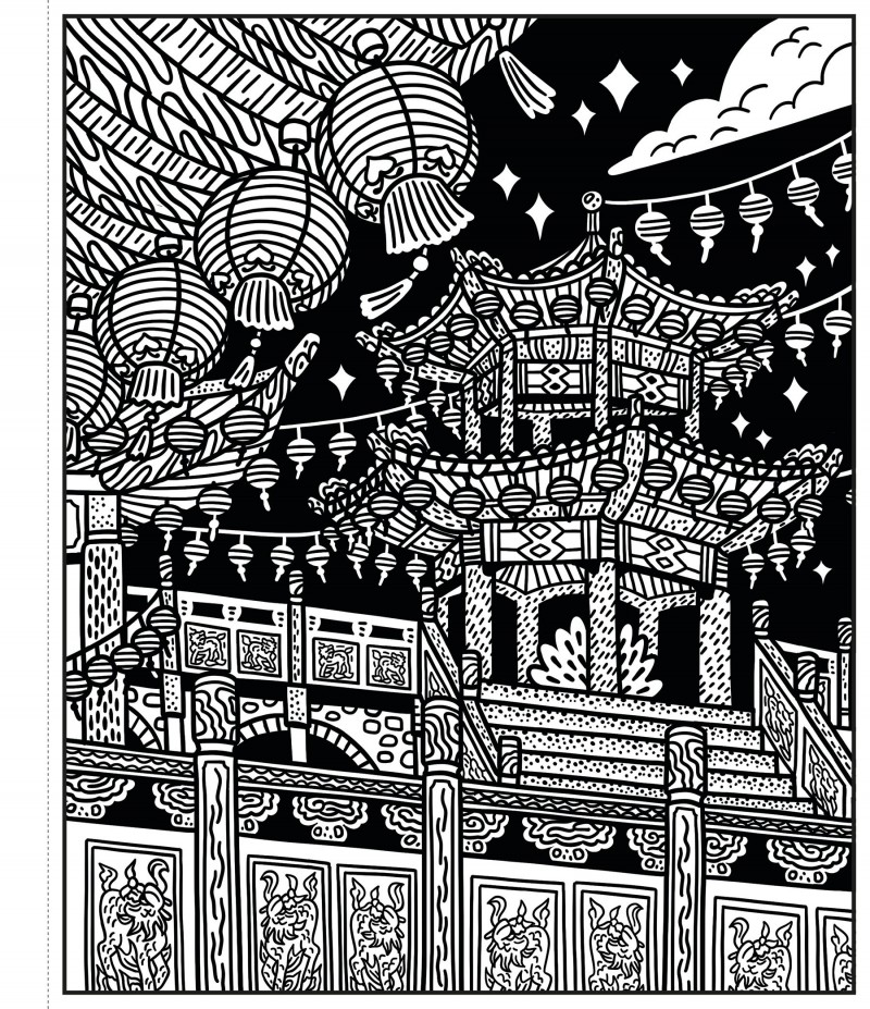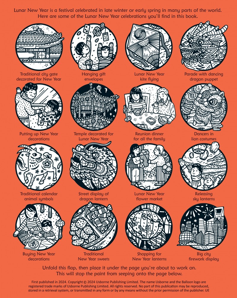 Packed with joyful scenes showing Lunar New Year being celebrated in different countries around the world, from dragon dancers and delicious food to kite flying in South Korea and a gloriously decorated temple in Malaysia. Just brush water over the black and white designs to reveal an array of vivid hues.