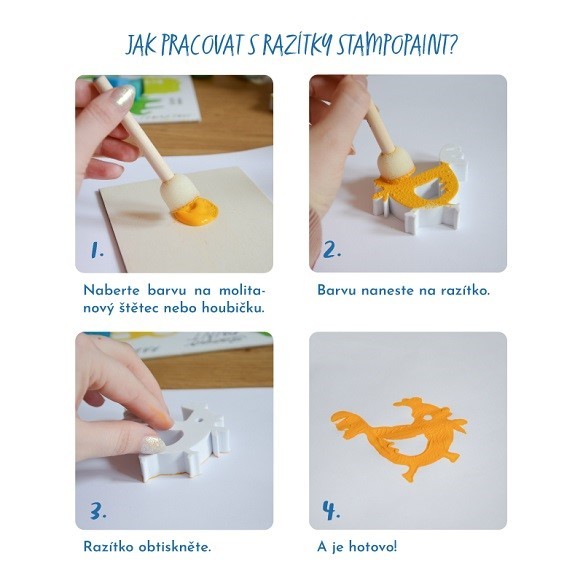 Velké obtisky razítek StampoPaint oceníte při tvoření - dokreslování detailů, vystřihování, k výrobě koláží, matematických pomůcek či k dekoraci textilních produktů. Krásně se obtiskávají i do hmot.