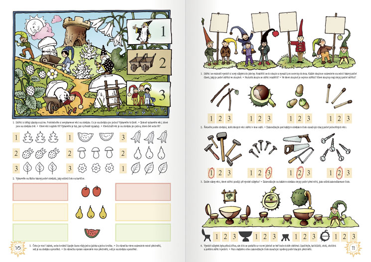 První díl pracovní učebnice využívá množství skutečných nebo pohádkových situacích ze světa skřítků, v nichž si děti uvědomí pojem „počet“ a naučí se rozumět obsahu čísel 0–7. Postupně jsou vyvozeny vztahy větší, menší, rovno a operace + a – v oboru 0–7.