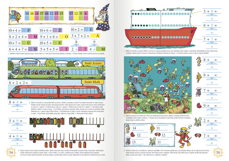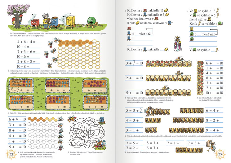 - Obsahuje operace sčítání a odčítání s přechodem přes desítku, přičemž ve 2. a 3. dílu byl před vyvozením přechodu věnován značný prostor procvičování, fixaci a automatizaci rozkladu 10, dočítání do 10 a sčítání tří sčítanců. Je obohacen obrazovou přílohou ke 2. a 3. dílu učebnice určenou k vystříhání a manipulační činnosti.