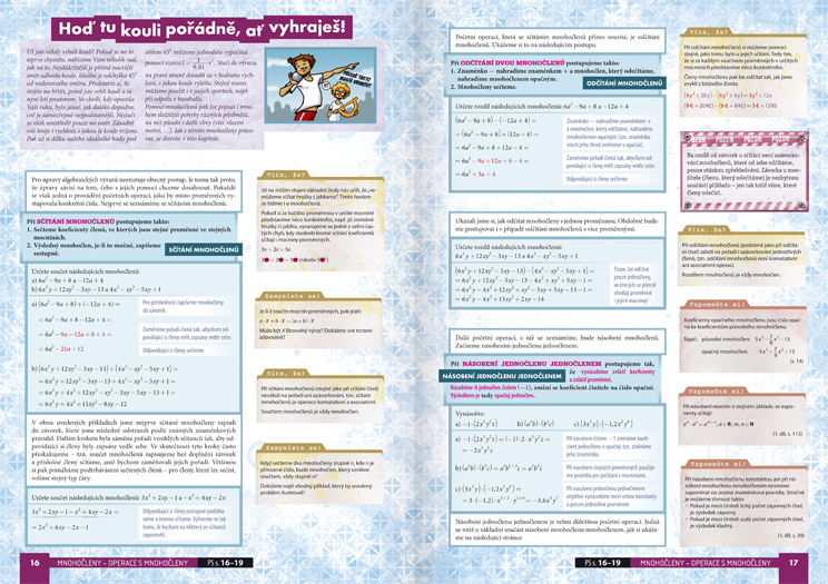 - Každý tematický celek učebnice je dále členěn na kapitoly. Rozsah jednotlivých kapitol se různí v závislosti na obtížnosti a obsáhlosti konkrétního učiva. Samozřejmostí je, že každá kapitola učebnice je propojena s příslušnou kapitolou pracovního sešitu, kde si studenti mohou novou látku dále procvičit. Všechny kapitoly učebnice mají jednotný formát, vždy obsahují motivační úvod, který umožní studentům uchopit učivo ve vztahu k jeho praktickému využití. Následuje výklad doprovázený komentovaným ilustračním příkladem. Jakýkoli nový postup nebo pojem, který je zaváděn, je pro přehlednost barevně odlišen. Nedílnou součástí učebnice jsou i boční texty, které zasazují probíranou látku do historického kontextu a odkazují k již známým faktům, které studenti potřebují k jednotlivým oblastem učiva znát.