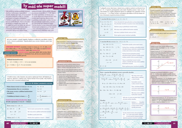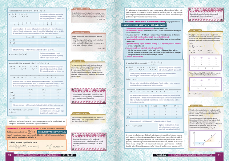 - Učebnice je rozdělena do čtyř tematických celků: 1. Výrazy, 2. Lineární rovnice, nerovnice a jejich soustavy, 3. Kvadratické rovnice, nerovnice a jejich soustavy, 4. Ostatní rovnice a nerovnice. Poslední tematický celek Ostatní rovnice a nerovnice je zaměřen převážně na učivo nad rámce RVP pro střední odborné vzdělávání, přínosný může být zejména pro gymnázia a k přípravě studentů směřujících na vyšší odborné či vysokoškolské studium.