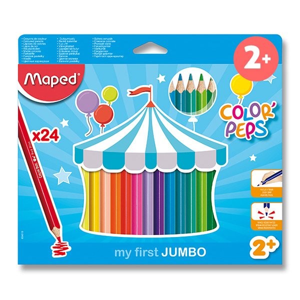 Souprava 24 kusů silných pastelek Color Peps v papírovém pouzdře. Trojhranné tělo, měkká a odolná tuha. Jemné barvy.Tloušťka tuhy: 4,7 mm