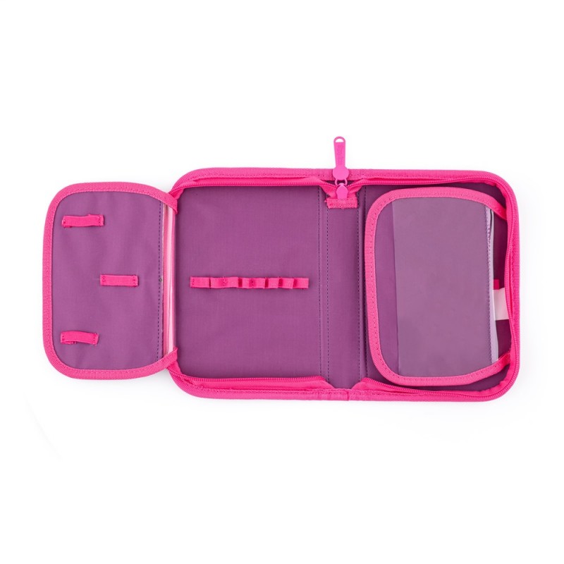 Jednopatrový školní penál s 2 chlopněmi, prázdný obsahuje 25 gumových poutek pro uchycení psacích potřeb. Na vnitřních chlopních jsou průhledné fólie pro rozvrh hodin.