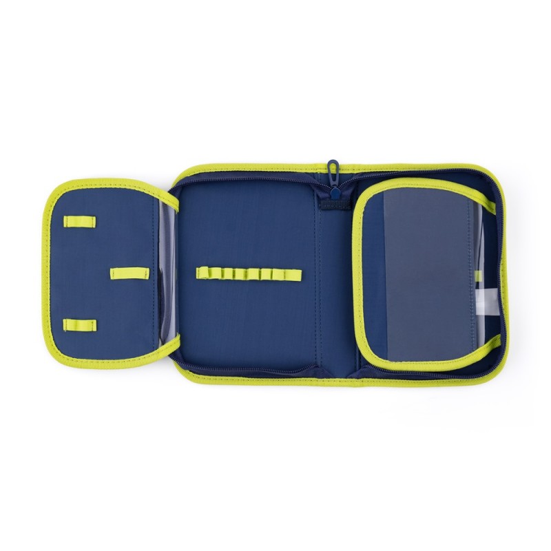 Jednopatrový školní penál s 2 chlopněmi, prázdný obsahuje 25 gumových poutek pro uchycení psacích potřeb. Na vnitřních chlopních jsou průhledné fólie pro rozvrh hodin. Rozměr: 205x140x35mm, Hmotnost: 0,2kg