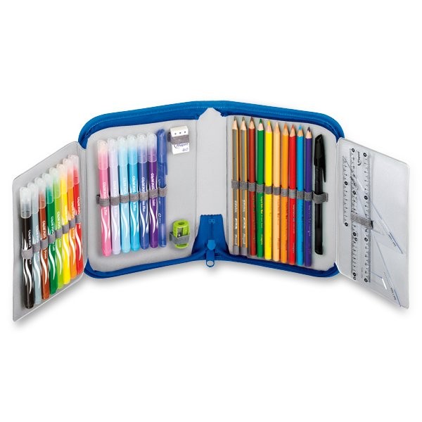 Jednoduchý rozkládací penál s 2 chlopněmi, vybavený značkovými potřebami Maped v hodnotě cca 185 Kč. Uzavírání na zip. Rozměr: 14,2 x 20,5 x 4 cm