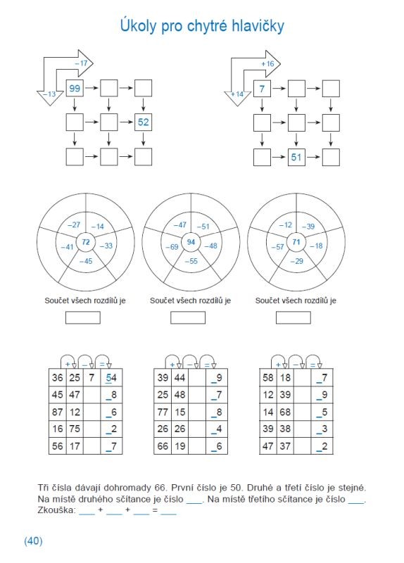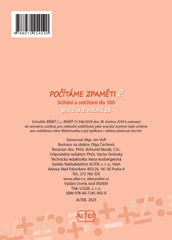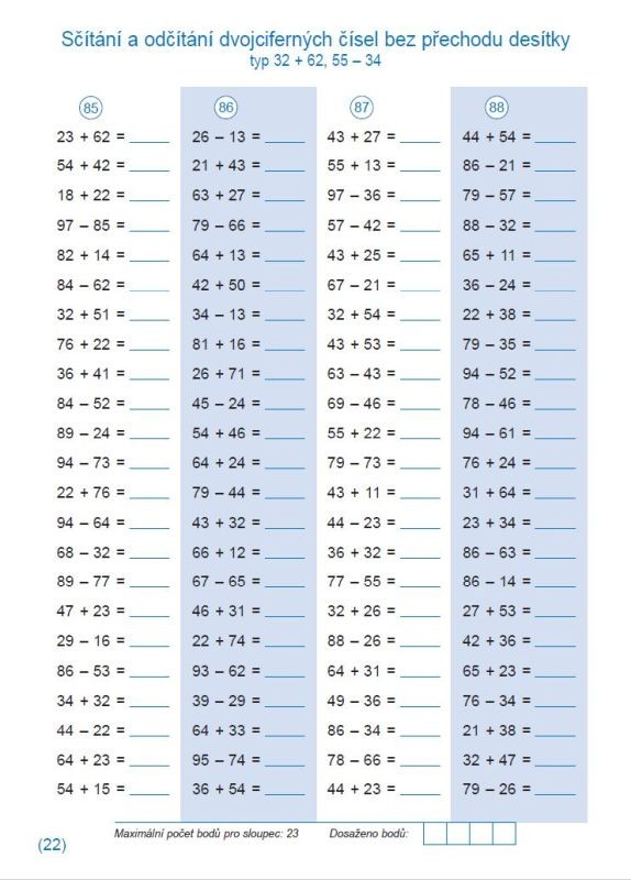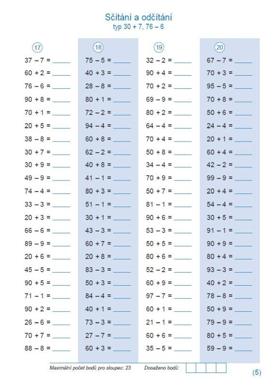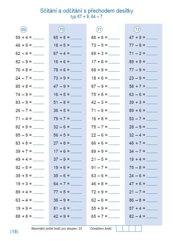 Pracovní sešit k procvičování sčítání a odčítání do 100 obsahuje 112 sloupců pětiminutovek. Při soustavné práci s ním dosahují žáci velmi dobrých výsledků v pamětném počítání. Kontrolu správnosti výpočtů mohou provádět sami podle připojených výsledků.