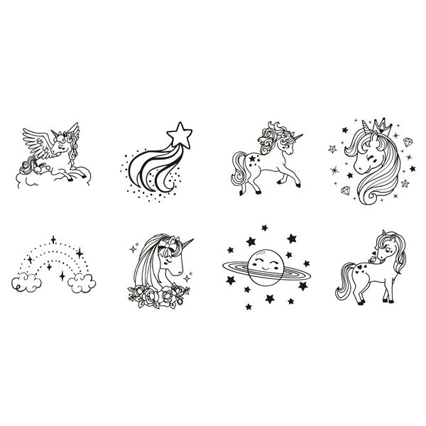 Sada 8 dětských razítek s motivy jednorožců a razítkovací polštářek černé barvy. Kvalitní dřevěná razítka pro děti v nové EKO-FRIENDLY řadě, roztomilá a všestranně využitelná.