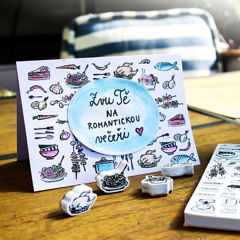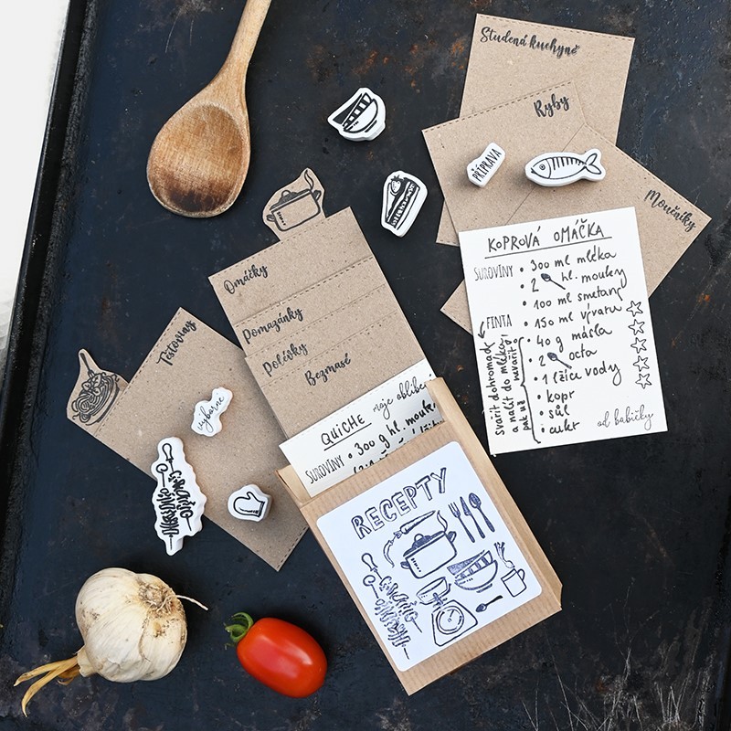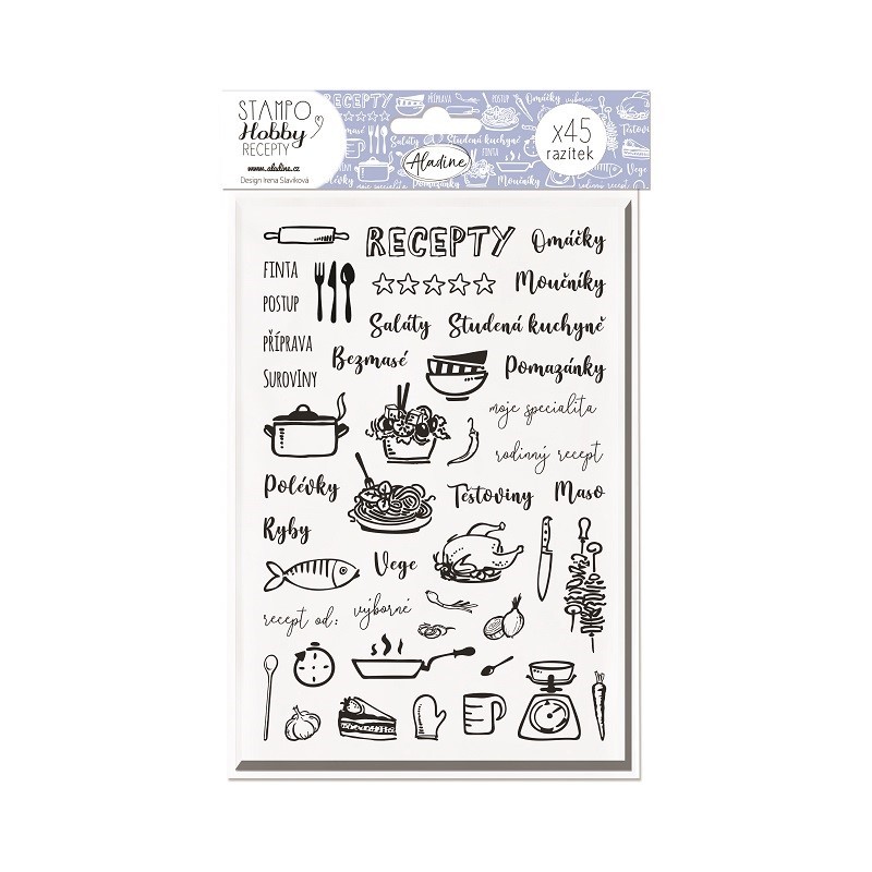 Originální sada gumových razítek na pěnové hmotě s českými nápisy a obrázky k receptům. Sada obsahuje 45 razítek v praktickém balení. Rozměr archu je 13,2 x 19,2 cm.